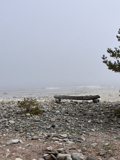 Den rundan gjorde vi tillsammans alla fyra och vi gav oss iväg på förmiddagen. Dimman från havet låg fortfarande kvar inne i skogen.